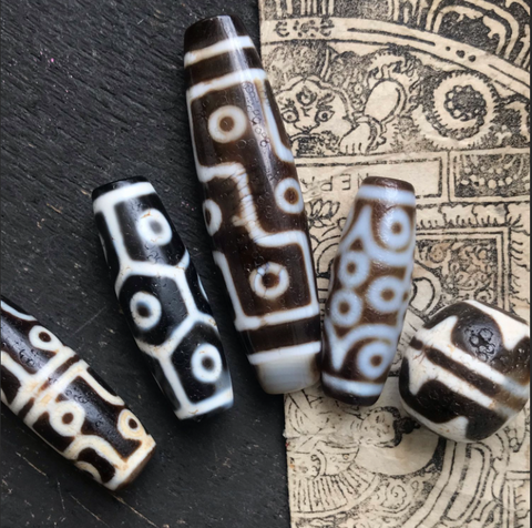ジ石は、紀元前2000年から1000年頃の中世インドで初めて登場しました。チベットの戦士たちがペルシャとの戦闘後にジ石をいくつか持ち帰ったと伝えられています。彼らは邪眼の破壊的な効果を非常に懸念していました。ジ石は邪眼を払い除ける力があると信じられていました。瑪瑙がベースの石として使用され、古くから知られていた技法を用いてビーズに様々な装飾が施されました。