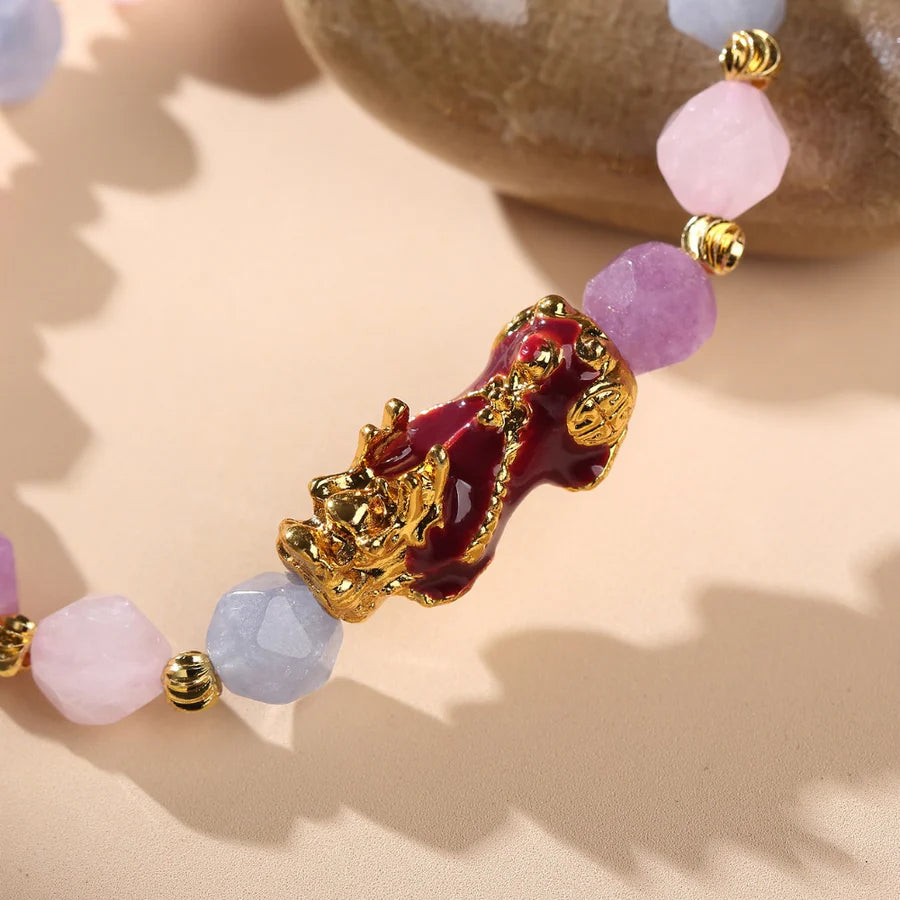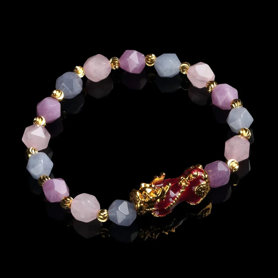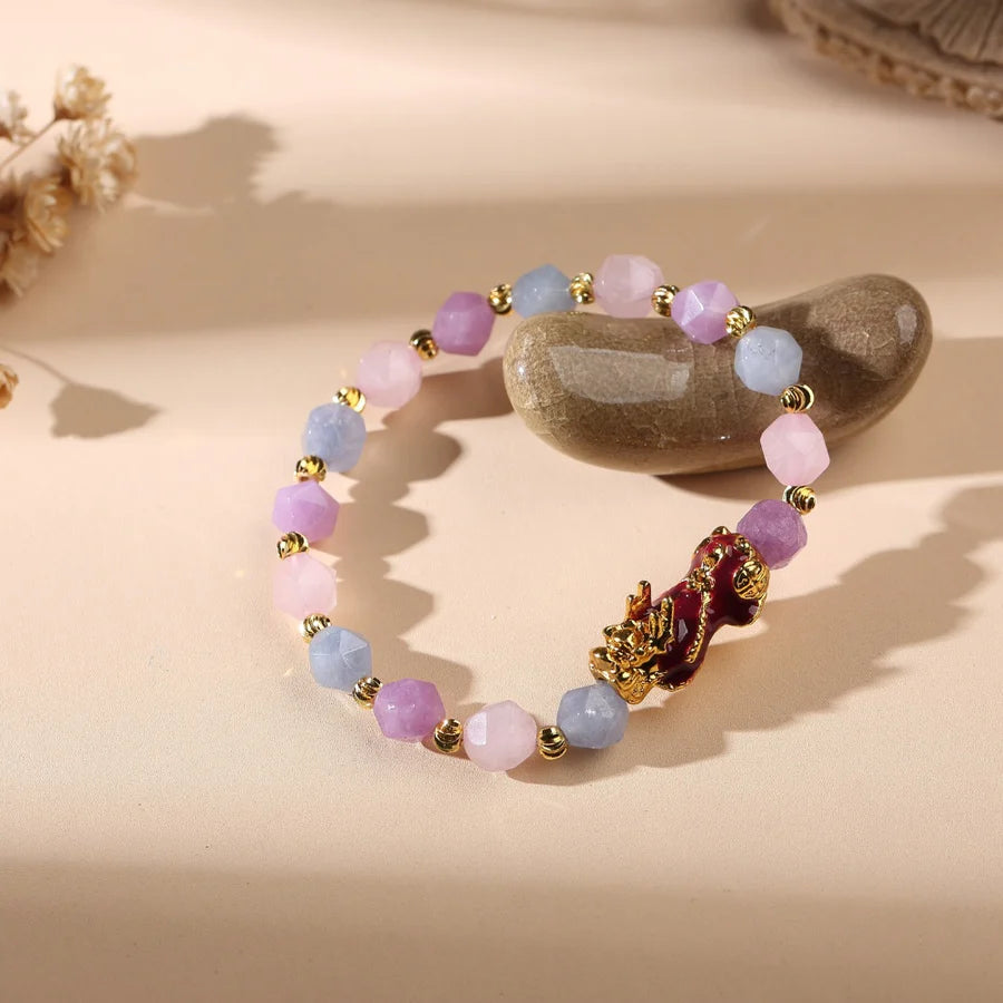 這款手鍊具有強大的組合 紫水晶, 海藍寶石,和 玫瑰石英,一種以支持繁榮心態而聞名的晶體。它還由 貔貅是傳說中的風水符號,具有招財和護身的作用。