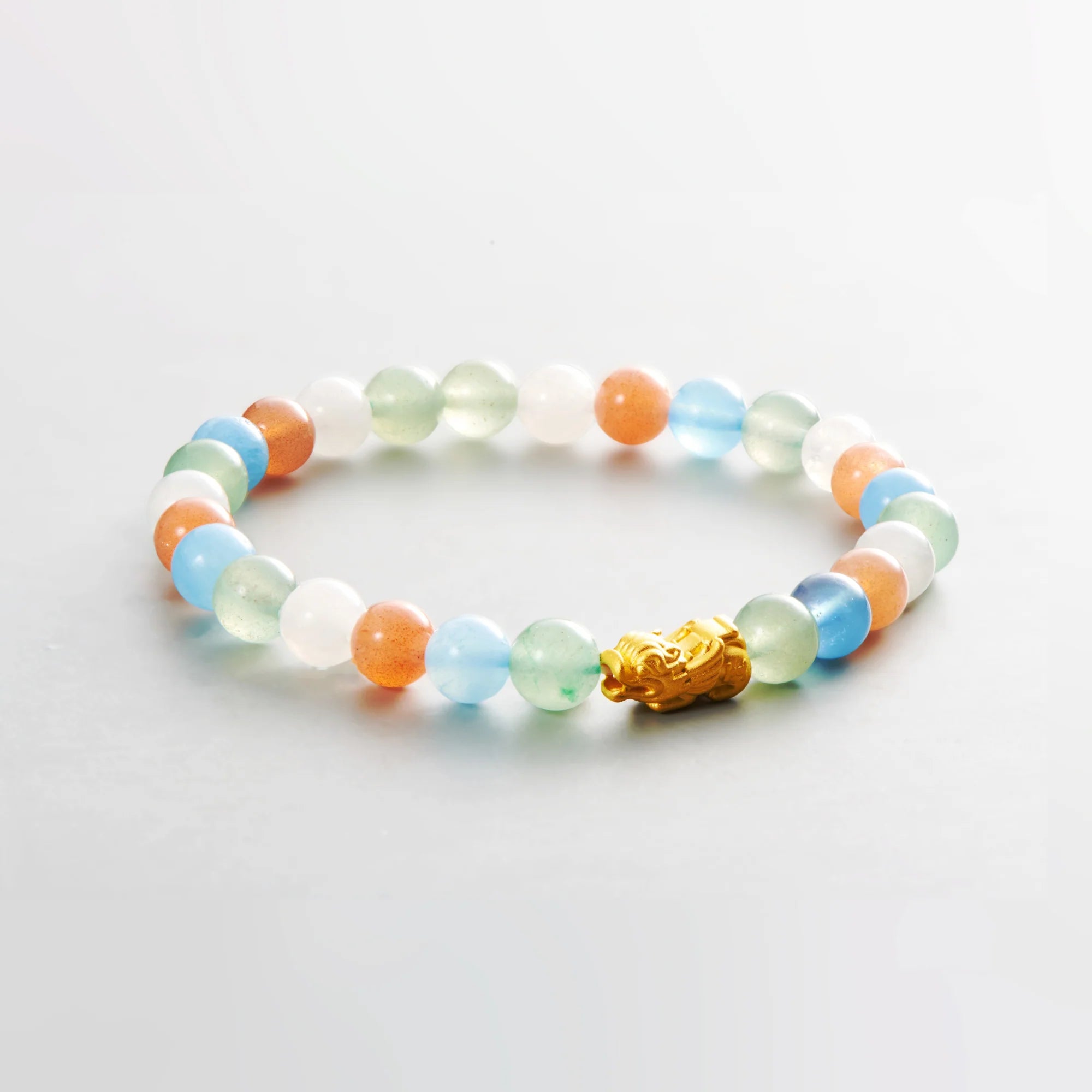 和諧貔貅手鍊將平衡與積極性融為一體。這款手鍊上鑲有像徵和平的白玉、象徵歡樂的日光石、象徵機會的綠色東陵石和象徵清澈的海藍寶石,散發著寧靜與樂觀的氣息。 0.3 克 999 純金貔貅可招財進寶,增強寶石的和諧能量。和諧適合那些追求充滿成長和寧靜的平衡和快樂生活的人。